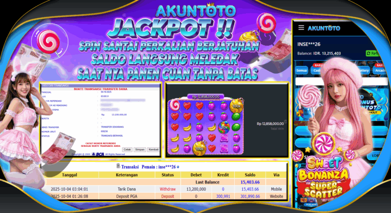 AKUNTOTO JACKPOT SLOT SWEET BONANZA SUPER SCETTER Rp 13.200.000 SABTU 04 OKTOBER 2025 Selamat kepada User id : INSE***26 Telah berhasil mendapatkan kemenangan besar pada permainanSLOT SWEET BONANZA SUPER SCETTER 5 – 10 menit pihak AKUNTOTO sudah melakukan transfer kepada pemilik User id dan dana sudah dapat di cairkan oleh pemenang. Bukti pembayaran yang kami…