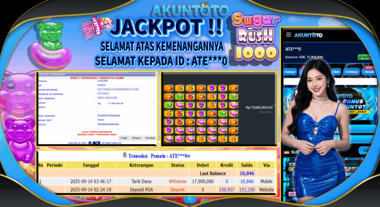 AKUNTOTO JACKPOT SLOT SUGAR RUSH 1000 Rp 17.900.000 MINGGU 14 SEPTEMBER 2025 Selamat kepada User id : ATE***0 Telah berhasil mendapatkan kemenangan besar pada permainanSUGAR RUSH 1000 5 – 10 menit pihak AKUNTOTO sudah melakukan transfer kepada pemilik User id dan dana sudah dapat di cairkan oleh pemenang. Bukti pembayaran yang kami berikan merupakan bukti…