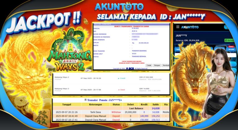 AKUNTOTO JACKPOT SLOT MAHJONG WAYS 2 Rp 29.000.000 JUMAT 08 SEPTEMBER 2025 Selamat kepada User id : JAN****Y Telah berhasil mendapatkan kemenangan besar pada permainanMAHJONG WINS BONUS Rp 29.000.000 5 – 10 menit pihak AKUNTOTO sudah melakukan transfer kepada pemilik User id dan dana sudah dapat di cairkan oleh pemenang. Bukti pembayaran yang kami berikan…